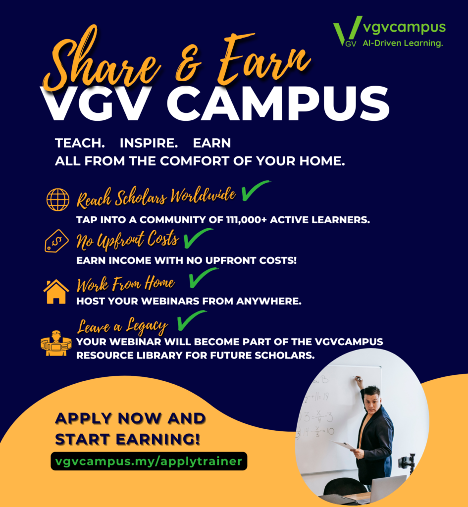 The VGV Campus Share & Earn Program is a forward-thinking initiative aligned with the National AI Initiative in the Fourth Industrial Revolution (IR 4.0). It aims to connect experts, educators, and professionals with a dynamic community of over 111,000 scholars worldwide, fostering knowledge sharing in cutting-edge fields.